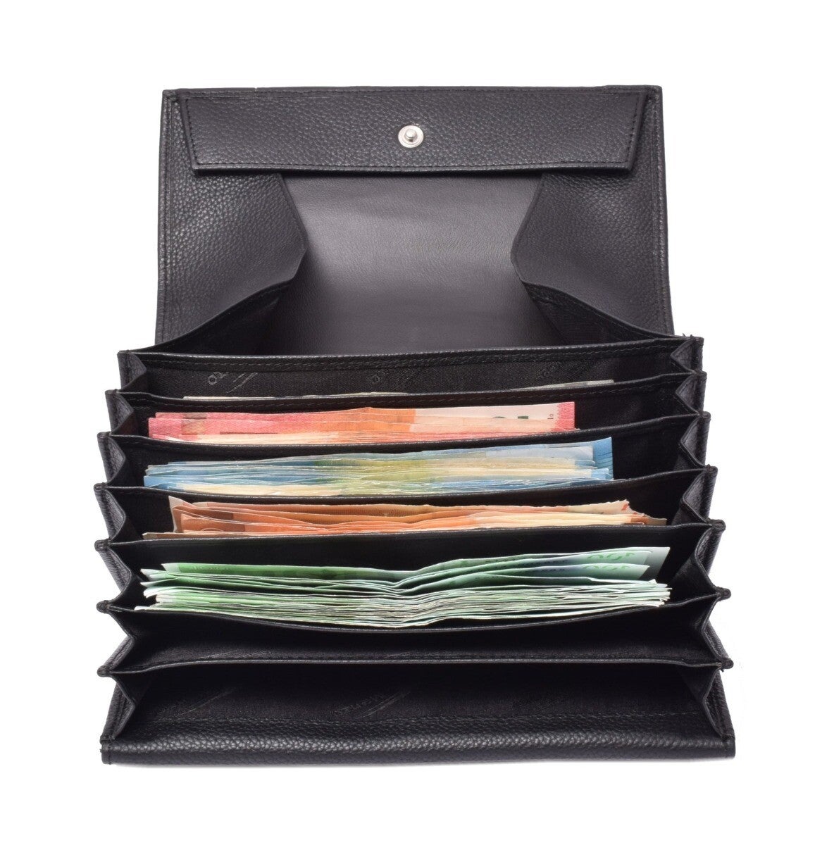 Kelnersbeur met laderslot. Op de foto staat de boldrukker afgebeeld. Indeling; 7 papiergeld vakken, 1 groot muntgeld vak, 1 extra vak t.b.v. biljetten en 1 insteekvak aan de buitenkant t.b.v. notitieblok. Afmeting; 18.3x10x3.9cm