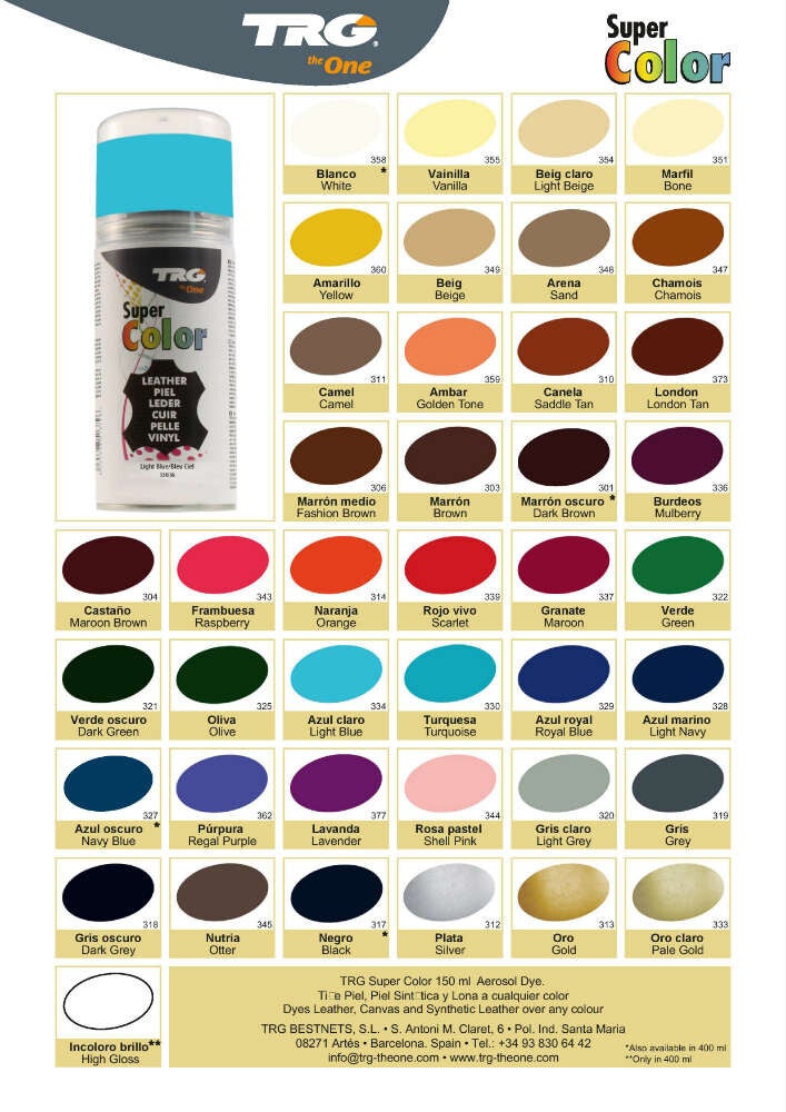 TRG leerverf is een speciaal samengestelde spuitverf om leer, vinyl en plastic schoenen, bekleding en accessoires te verbeteren, vernieuwen of van kleur te veranderen.
